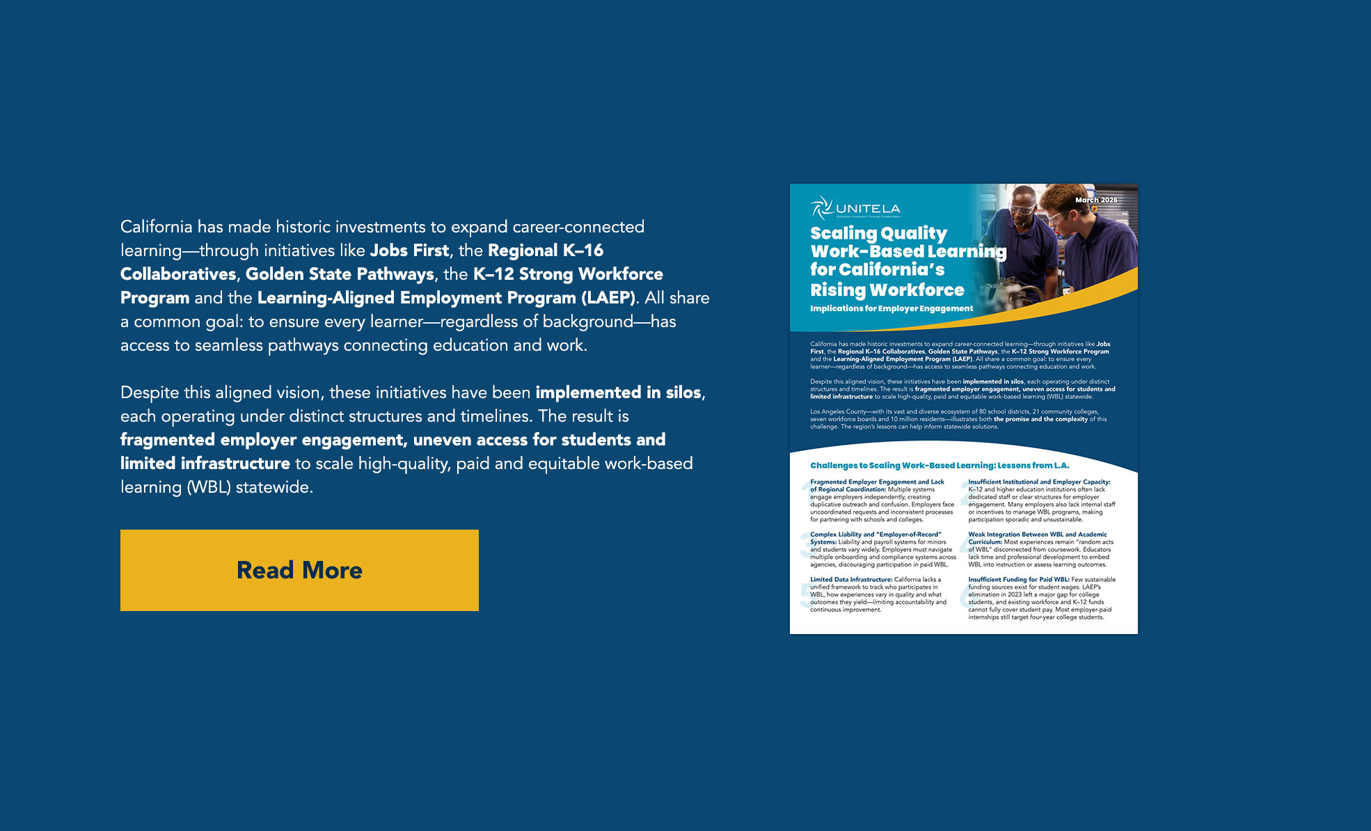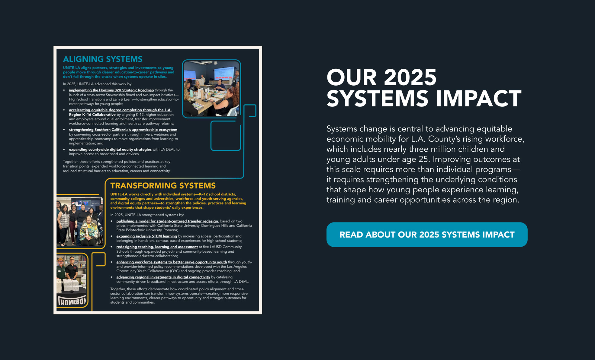 UNITE-LA has championed equitable, economic mobility via cradle-though-career education and workforce development efforts that strengthen systems, policies and high-quality education and career pathways. UNITE-LA serves as an intermediary, collaborating with key stakeholders—including educators, employers, policymakers and community leaders—to ensure all individuals, especially those facing systemic barriers, have opportunities to thrive. Co-founded by the City of Los Angeles, L.A. Unified School District and L.A. Community College District, UNITE-LA is grounded in the region with state and national partnerships extending its impact throughout California and the U.S.