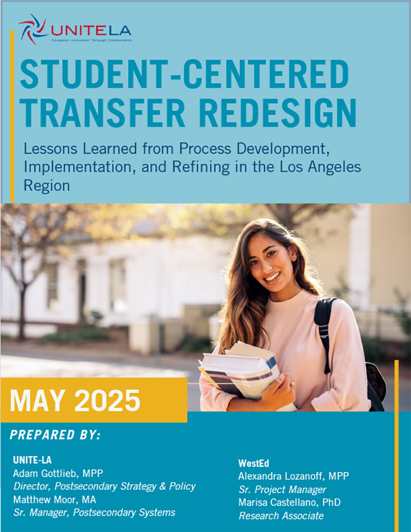 Over the course of two summers, UNITE-LA worked closely with groups from California State University, Dominguez Hills and California Polytechnic University, Pomona and their respective feeder community colleges to explore institutional data, hear from students, and assess transfer barriers and opportunities. Collectively, participants from transfer offices, academic affairs, admissions, academic departments, and student services identified root causes to problems that students experience and ideated and piloted solutions to support student success. This new report on the student-centered transfer redesign process details what it took for campus partners to come together, critically assess their own policies and practices, and work together to make sustainable changes that have transformed their approach to the transfer system.